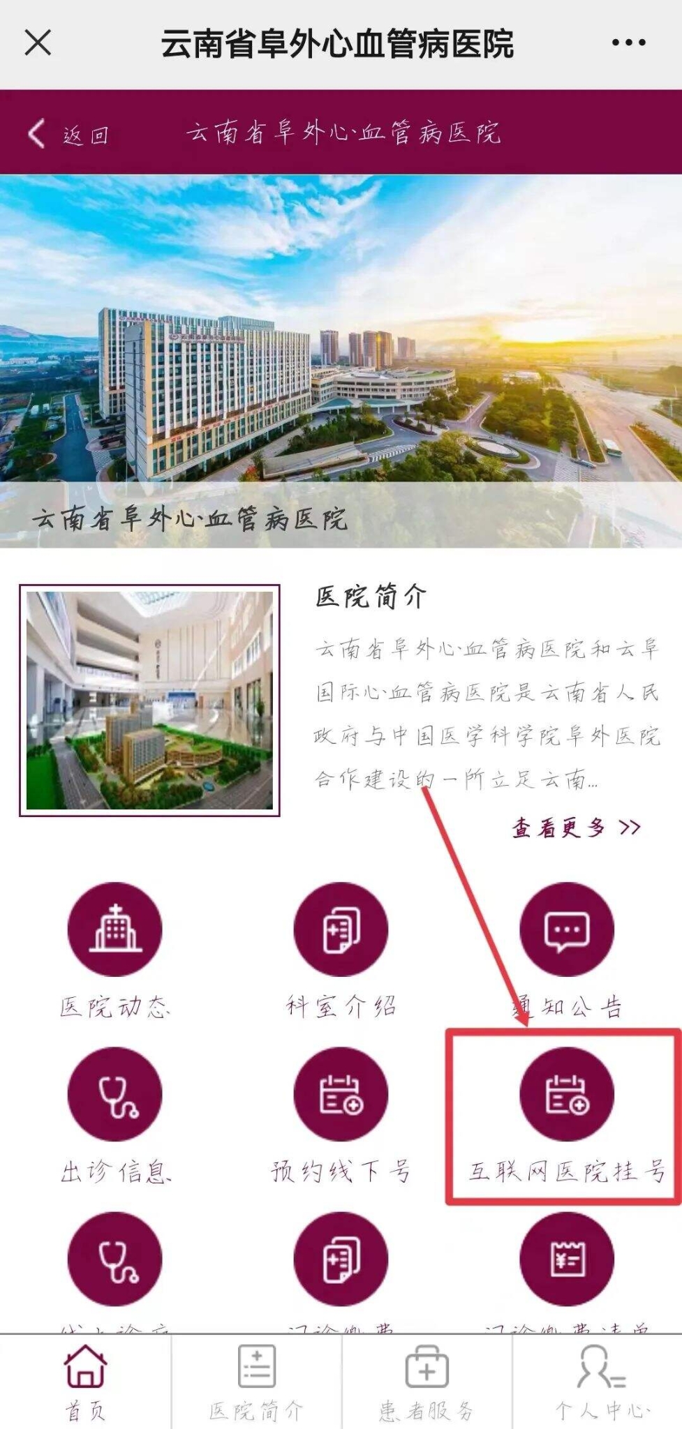 ①微信关注“云南省阜外心血管病医院”公众号,点击下方“医院首页”一栏进入登录页面,医院首页页面下方选择“互联网医院挂号”。