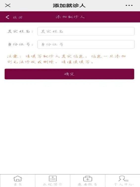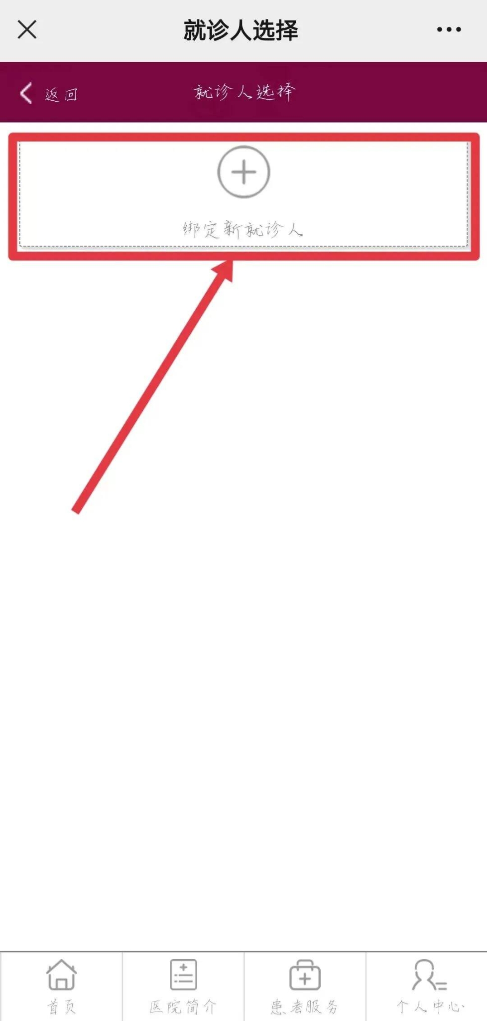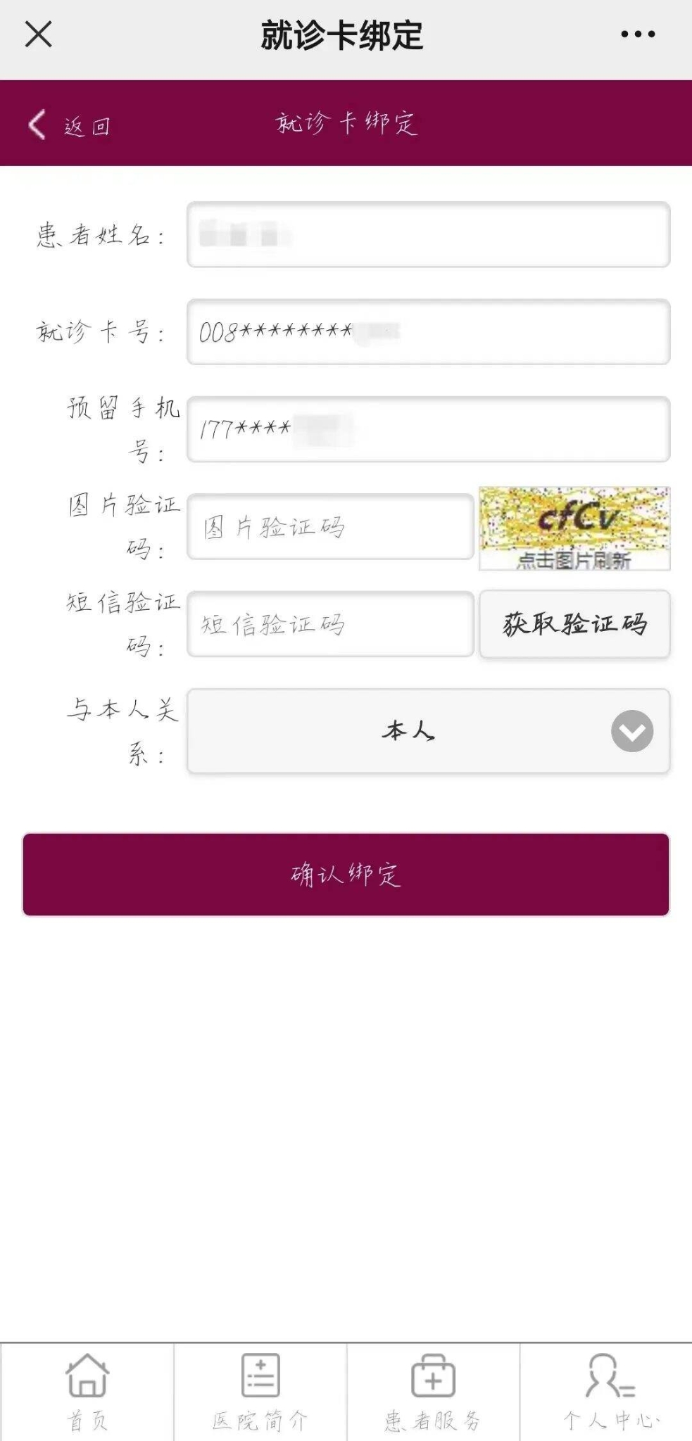 ③添加就诊人填写就诊人相关信息,进入就诊卡绑定页面验证就诊人信息,核对并确认绑定。