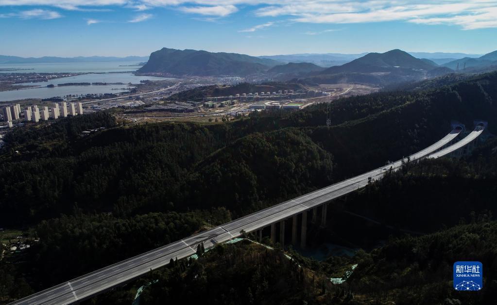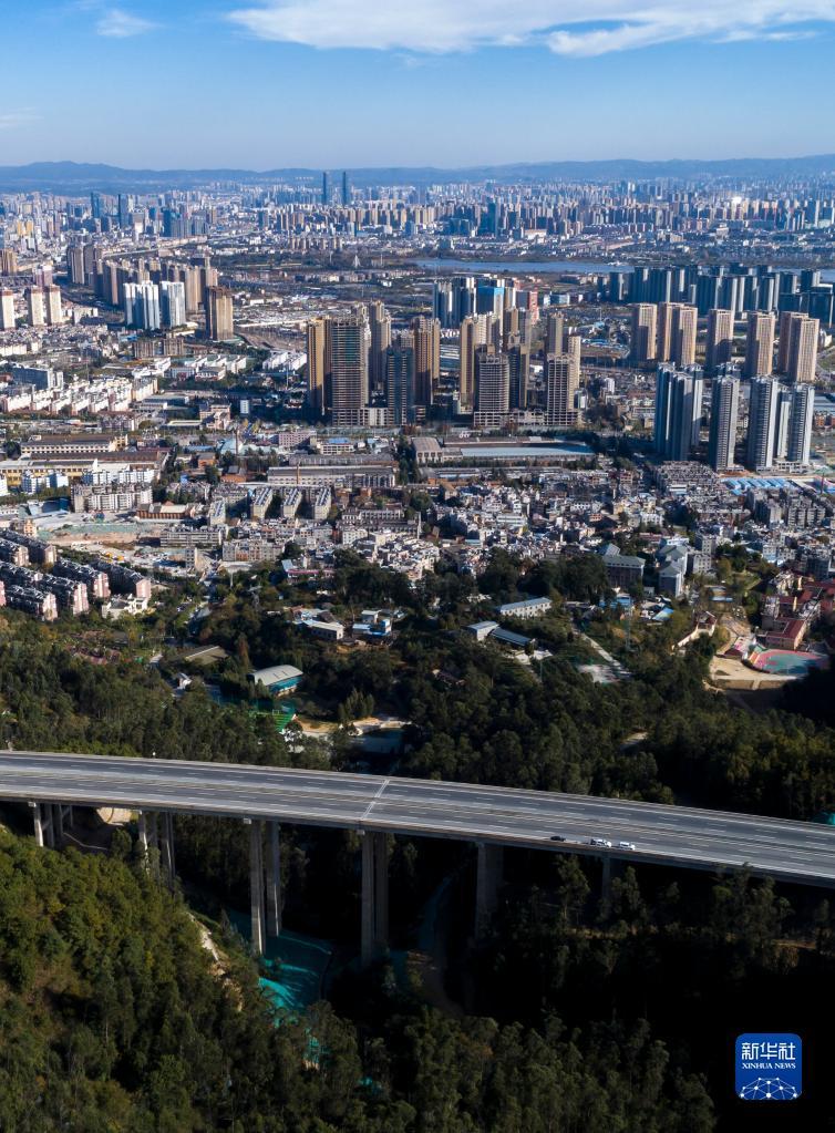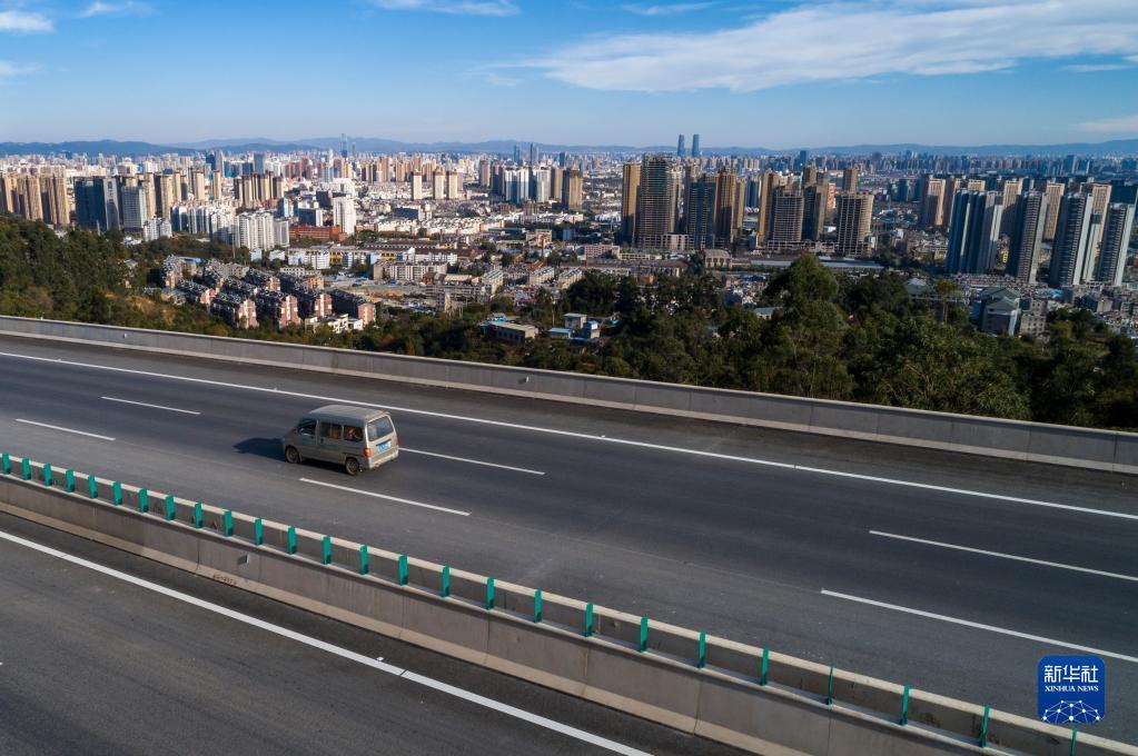 这是12月8日拍摄的新昆楚高速昆明入城段一景,远处是昆明主城区(无人机照片)。新华社记者陈欣波/摄