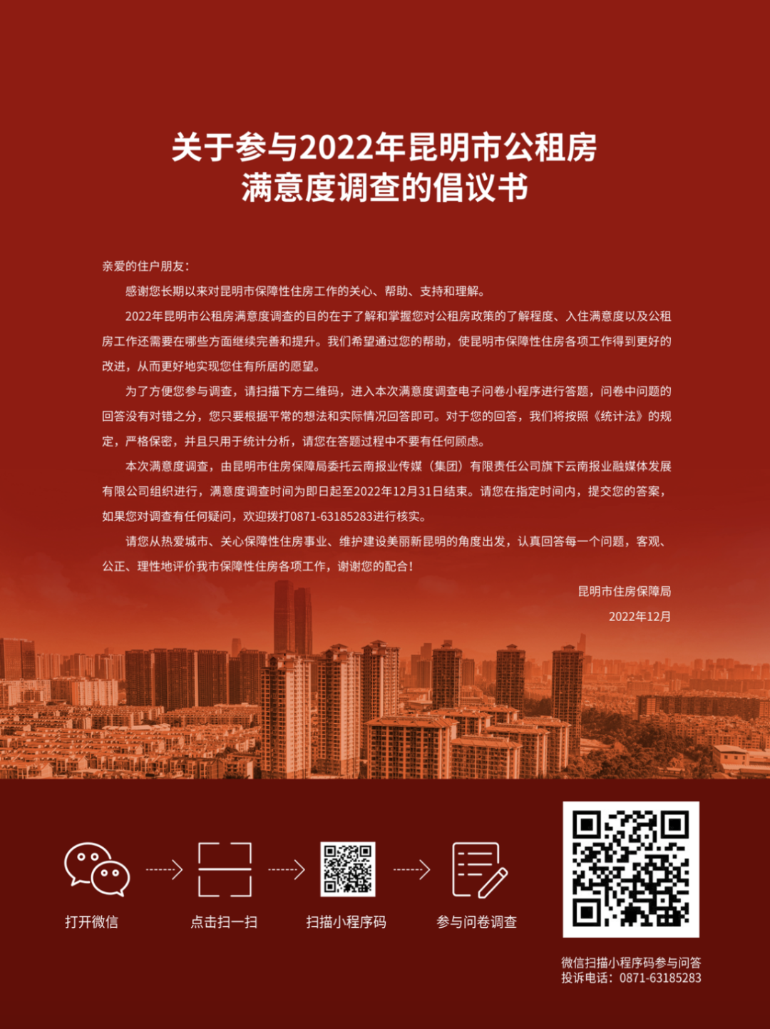 昆明信息港讯 记者上官艳君 为切实提升昆明市公共租赁住房管理服务水平,提升广大租户居住的幸福感和安全感,近日,昆明市住房保障局开展2022年昆明市公租房满意度调查,调查通过线上问卷的方式进行,扫码即可参与。