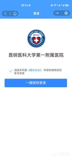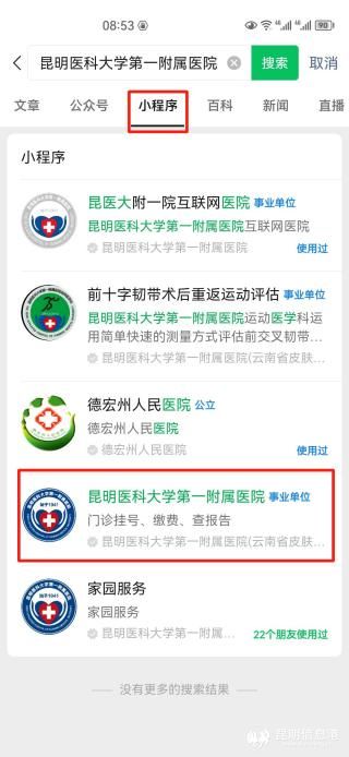 1.搜索【昆明医科大学第一附属医院】微信小程序打开微信搜索小程序“昆明医科大学第一附属医院”,选择如图所示选项,点击并进入小程序。