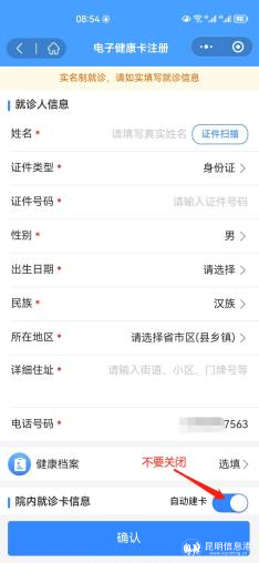 初次使用该小程序,需要微信授权登录,完成电子健康卡授权并添加就诊人,用户点击任意功能开始此步骤;用户按照系统提示完成即可(注意就诊人实名信息填写时不要关闭自动建卡开关)。