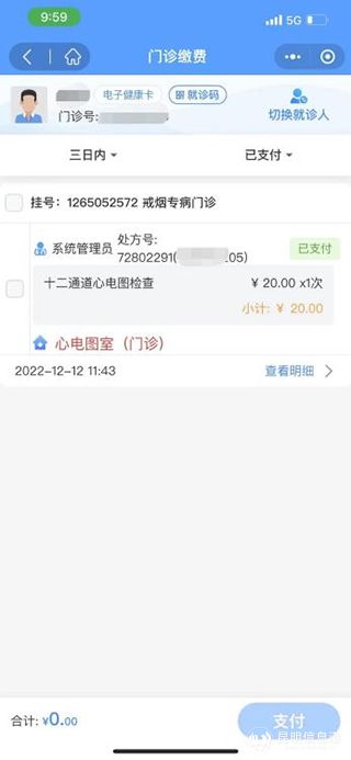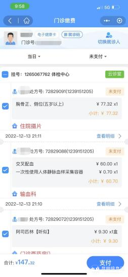 9.看诊后,医生如开具药品处方/检验检查,患者可到首页门诊缴费处选择待缴费的医嘱处方进行缴费。