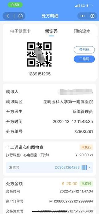 10.完成处方缴费后,在门诊缴费界面,可以选择已支付的处方进入处方明细界面,患者可凭二维码取药,或到检验检查科室处做相关的检验检查。
