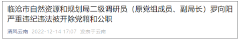 临沧市自然资源和规划局二级调研员(原党组成员、副局长)罗向阳严重违纪违法被开除党籍和公职