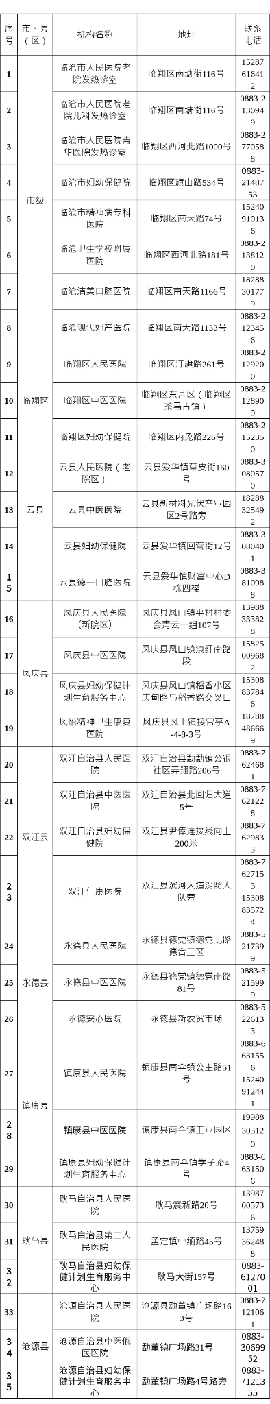 普洱市设置发热门诊机构信息