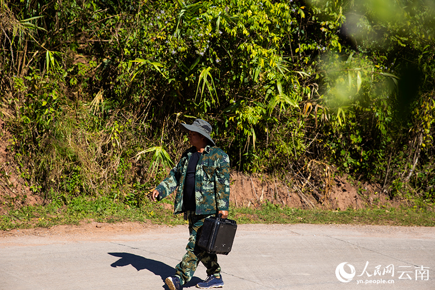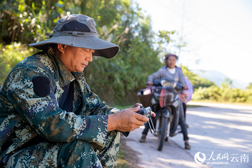 为保护亚洲象的同时守护人象和谐,当地选聘15名监测员,每天对亚洲象跟踪监测,及时发布亚洲象监测预警信息。47岁的彝族汉子刁发兴亚洲象监测员之一,他身体壮实,平日不苟言笑。图三和图四为刁发兴带着无人机去监测。人民网记者 程浩摄