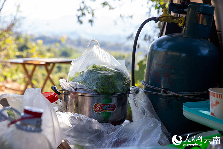 亚洲象下午在山林活动,早晨八九点钟休息。亚洲象活动到哪,监测员就得跟到哪,吃饭睡觉只能路上解决。所开的车里,折叠床、蔬菜、煤气罐等生活用品一应俱全。图五和图六为监测员所开车里的生活用品。人民网记者 程浩摄