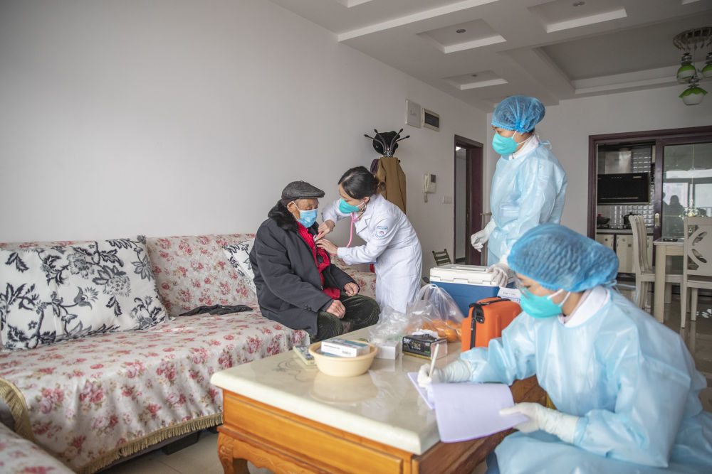 12月16日,在重庆市永川区中山路街道红河路社区居民家中,流动接种小分队为接种疫苗的老年人做接种前的问诊和身体检测。新华社记者 黄伟 摄