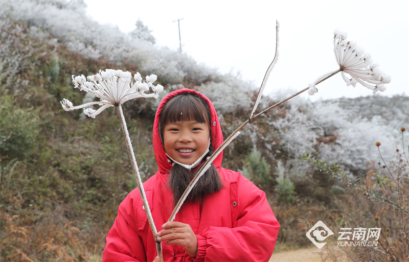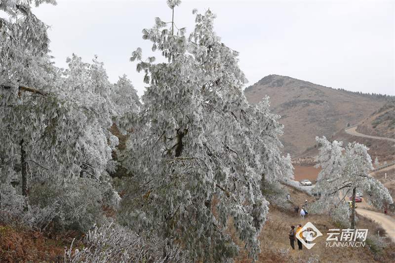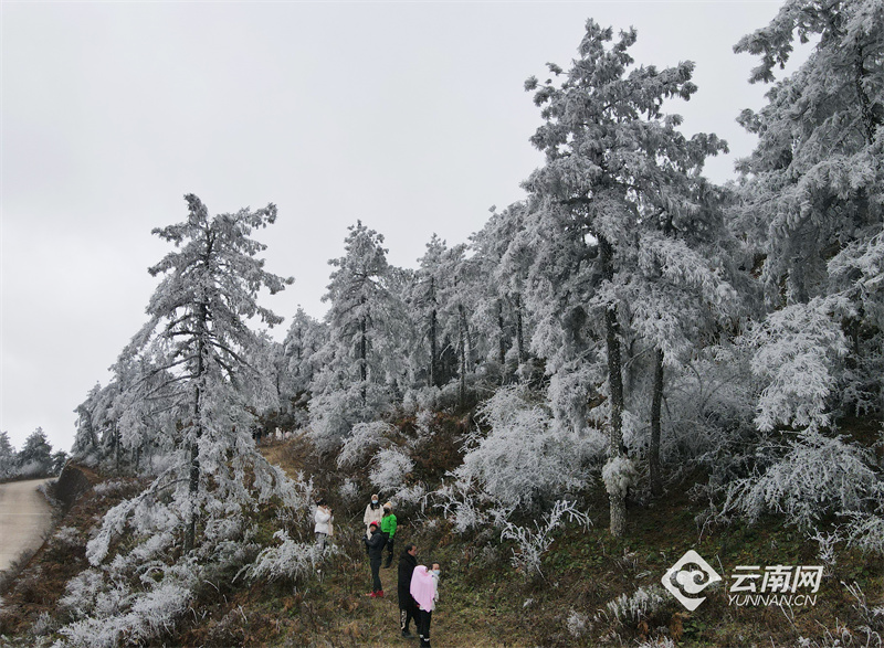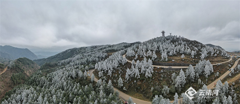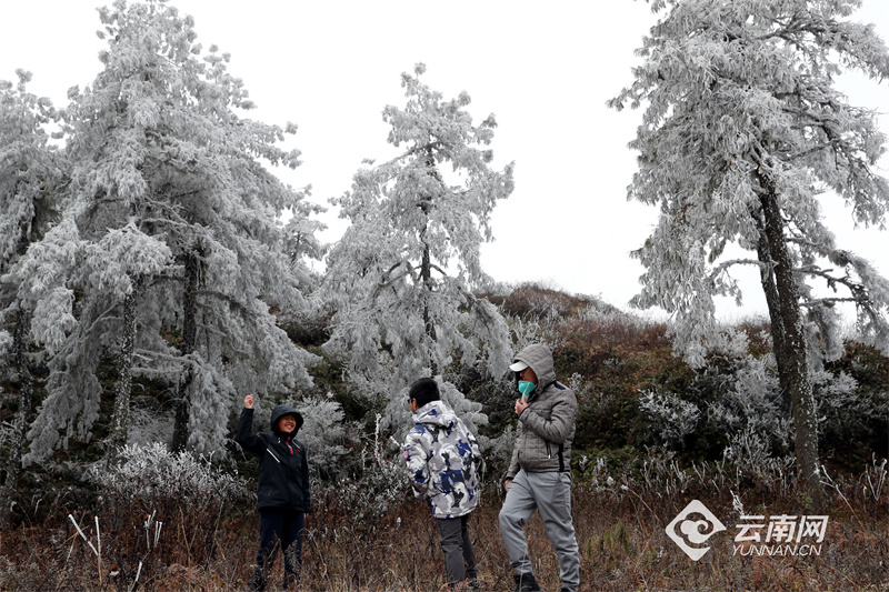 位于昆明呈贡与澄江之间的梁王山上因为降温出现雾凇美景,云雾缭绕的山间,树木银装素裹、雾凇晶莹剔透,随着草木形状呈现出各种各样美丽的造型。独特的雾凇奇观吸引来了大批市民涌上梁王山,近距离一睹这冬日别样的冰雪“童话世界”。