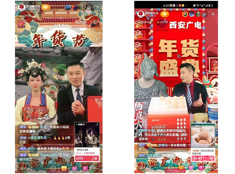 “西安曾因为一个人,一次次冲上城市热搜榜,从此,西安梦在更多人的心中落地生根,也成了各地游客来西安游玩的理由。”还记得那位眼神专注妩媚,姿态优雅又撩人,一下子就让人有种“梦回大唐”的网络名人“不倒翁”小姐姐皮卡晨吗?还有打卡大唐不夜城,现场吟诗与游客互动对诗送肉夹馍的“李白”吗?还有身着唐代武将盔甲,在石头上露出上半身,表情严肃地用锤子砸錾子的“石头哥”吗?这些西安知名的网络“大咖”纷纷来到“西安好生活直播间”热情助阵,他们身着鲜明的唐代传统服饰,带领消费者穿越历史,感受唐代传统文化的魅力,在虚实交织的场景中感受唐朝经济繁荣的新奇体验,同时,直播间里,网红也与西安广播电视台节目主持人亲密互动,营造起线上年货节热闹、喜庆、祥和的新年氛围,为全国各地的网络消费者营造不一样的新年味道。