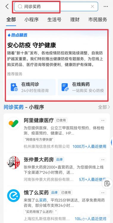 通过支付宝搜索“问诊买药”即可进入服务专区,包含“在线问诊”和“在线购药”两类服务。