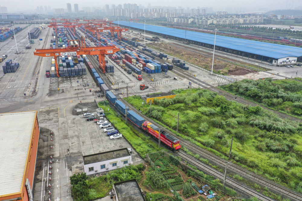 中欧班列(重庆)第10000列列车在重庆团结村中心站顺利驶出(2022年6月23日摄,无人机照片)。新华社记者 黄伟 摄