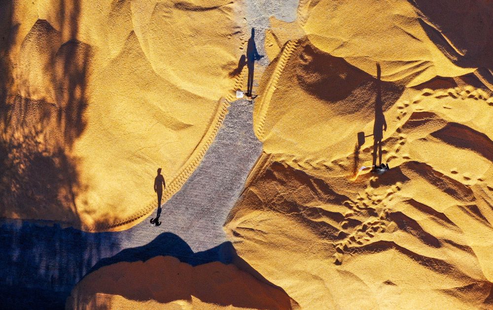 在内蒙古通辽市奈曼旗新镇舍布日图嘎查,工人在收粮站晾晒玉米(2022年10月18日摄,无人机照片)。新华社记者 连振 摄