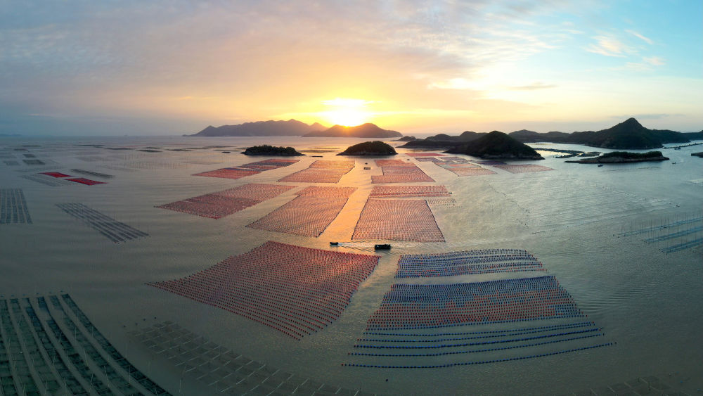 渔船沐浴朝霞,行驶在福建省霞浦县三沙镇海上养殖区(2022年10月26日摄,无人机照片)。新华社记者 姜克红 摄