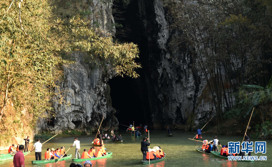 游客坐船进入有着“最后的世外桃源”之称的坝美村(2015年2月23日摄)。新华社记者 蔺以光 摄