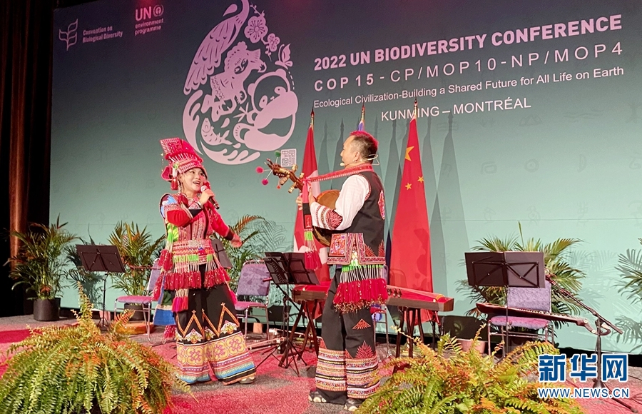 蒙特利尔当地时间12月6日晚,李怀秀、李怀福在COP15主席国招待会上演唱海菜腔。新华网发(张海萍 摄)