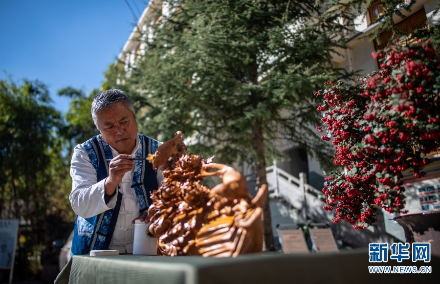 剑川木雕国家级非遗代表性传承人段四兴对木雕作品进行打蜡处理(12月2日摄)。新华社记者 胡超 摄