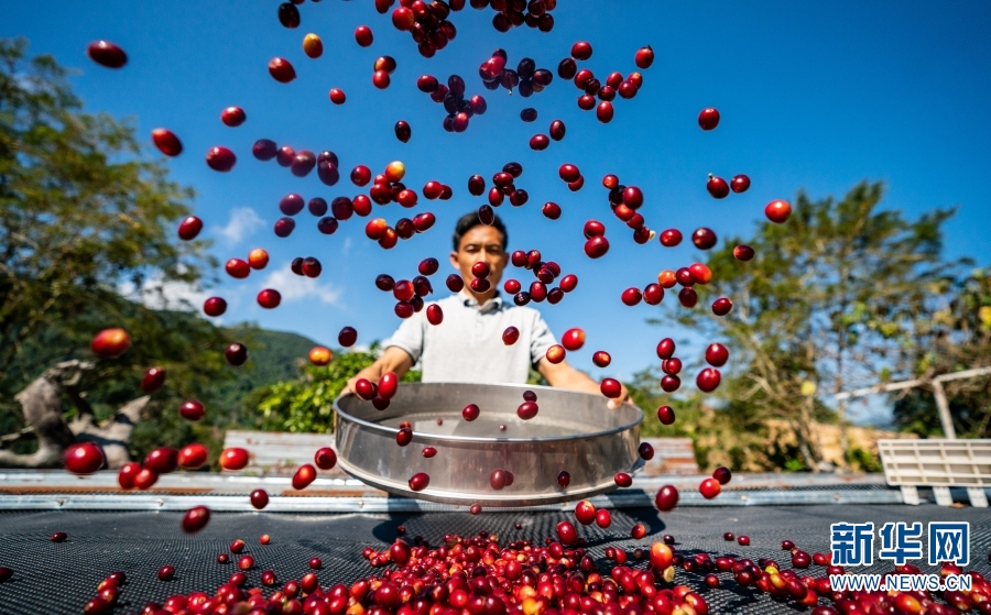 11月16日,在云南省普洱市野鸭塘河谷咖啡庄园,农民在晾晒咖啡果。新华社记者 江文耀 摄