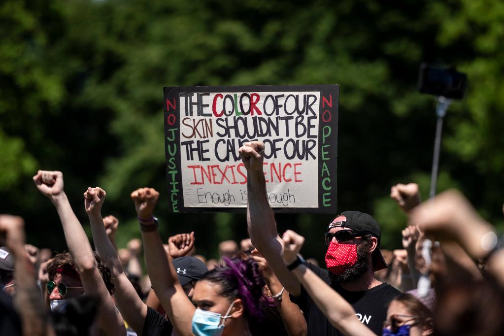 2020年5月乔治·弗洛伊德事件发生后,全美各地大规模反种族歧视抗议示威活动持续不断。图为同年6月6日,示威者手举标语“肤色不该成为我们死去的原因”在芝加哥参加游行示威。新华社发(克里斯·迪尔茨摄)