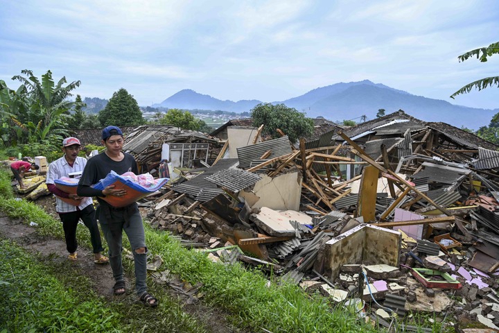 11月26日,印度尼西亚西爪哇省展玉的居民走过地震留下的废墟。新华社发(祖卡南摄)