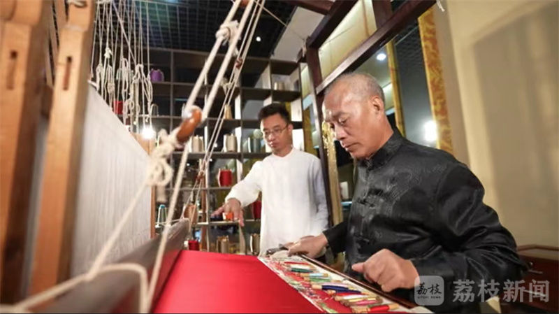 “脑子活,坐得住,上手快”。有着30年南京云锦织造经验的“老师傅”杨建顺看上了这个“小师傅”。他觉着眼前这个机灵小伙光忙着改造织机有点可惜,“何不教他把南京云锦木机妆花手工织造技艺一起操练起来?”揣着这个念头,杨建顺向陈诚伸出了“收徒”橄榄枝。就这样,2012年,27岁的陈诚从机械跨行纺织,正式踏上了“子承父业”的道路。