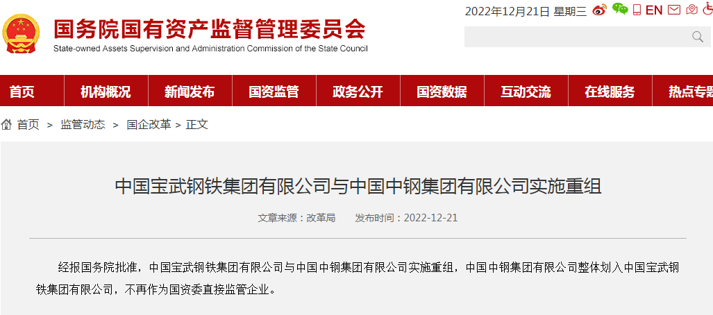 12月21日,国资委称,经报国务院批准,中国宝武钢铁集团有限公司(下称“中国宝武”)与中国中钢集团有限公司(下称“中国中钢”)实施重组,中国中钢整体划入中国宝武,不再作为国资委直接监管企业。