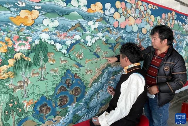 新华社拉萨12月22日电 记者春拉 冬日的早晨,西藏自治区日喀则市非物质文化遗产展示中心的画室内,43岁的西落正仔细端详着眼前的画作——画布上,远处白雪覆盖的珠穆朗玛峰与近处的绿水青山相辉映,花果丰饶的山水间,藏羚羊、梅花鹿等嬉戏奔跑,一派生机盎然的高原景象……
