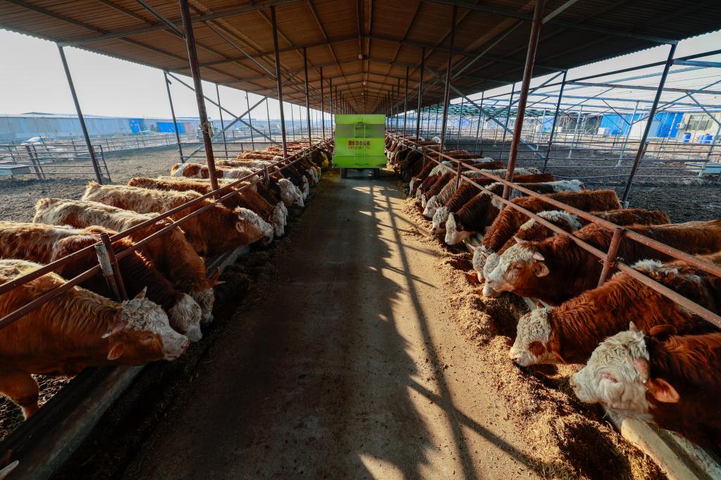 12月19日,董树阁驾驶投料机在牛棚喂食肉牛。(受访单位供图)