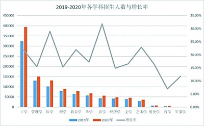 2020年研究生招生总量较上一年增长20.73%。从各学科增长率方面看,农学是增长率最高的学科,达到了31.85%。其次是医学,招生人数增长率达到了29%。