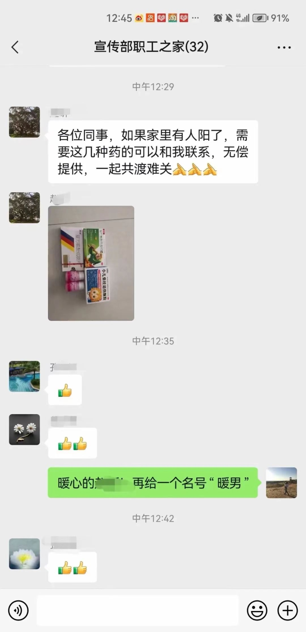 “各位同事,如果家里有人阳了,需要这几种药的可以和我联系,无偿提供,一起共渡难关”。一石激起千层浪,微信群里信息接连不断:“我家有这几种药,需要的说一声”“我别的药买不着,咳嗽的有两三种,有需要的和我说”“哪家有困难,互相吱一声,互助互爱”……这是普洱市委宣传部职工之家微信群不断弹出的暖心信息。