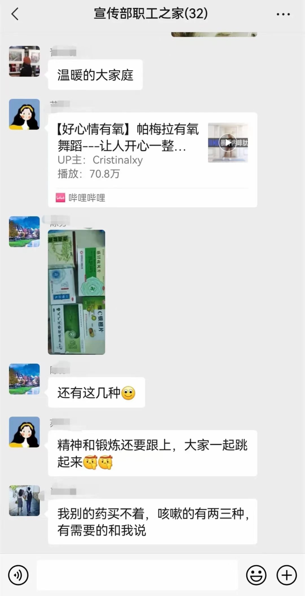 群里有送药品的、有互相关心鼓励的、有出防疫招数的、有调动大家积极性的,让爱以另一种形式传播在大家心中。
