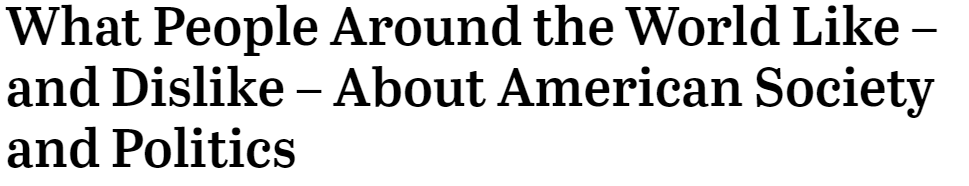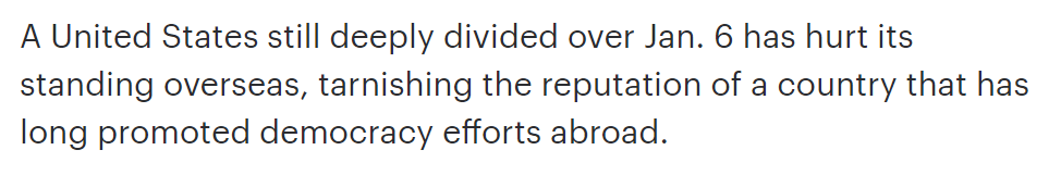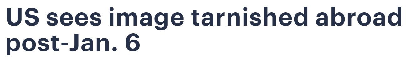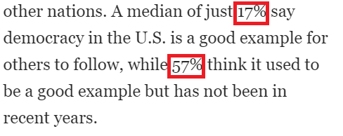 皮尤研究中心2021年11月发布的一项针对国际受访者的调查发现,只有17%的人认为所谓“美式民主”是好榜样;而57%的人认为美国近年来已经不是好榜样了。