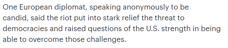 文章援引一位不愿透露姓名的欧洲外交官的话说,美国国会骚乱事件凸显出美国民主所面临的巨大威胁,并令人开始质疑,美国是否有能力克服这些挑战?