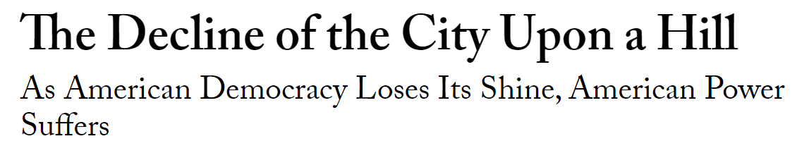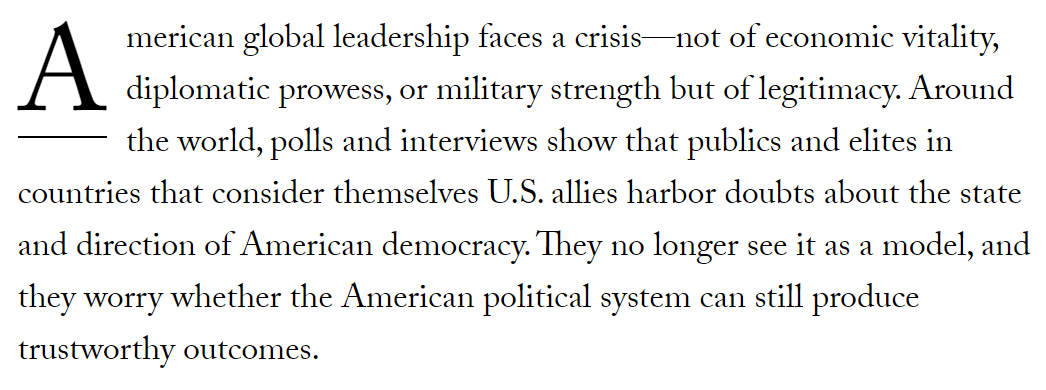 美国《外交》杂志今年10月发表文章称,美国的全球领导地位面临危机——不是经济活力、外交实力或军事实力的危机,而是合法性的危机。