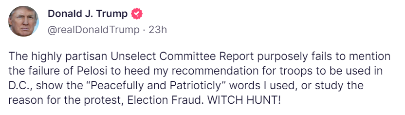在今年12月19日众议院特别调查委员会做出相关建议之后,特朗普随即在个人社交平台发表声明称,众议院的议员企图对他提出虚假指控,目的之一是阻止自己再次竞选美国总统并胜出,这些指控是一种将他和共和党边缘化的企图。