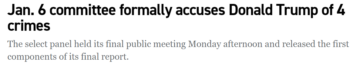 调查委员会建议美国司法部对特朗普作出4项起诉,分别是煽动叛乱;妨碍官方程序;用阴谋欺骗美国;阴谋作出虚假陈述。