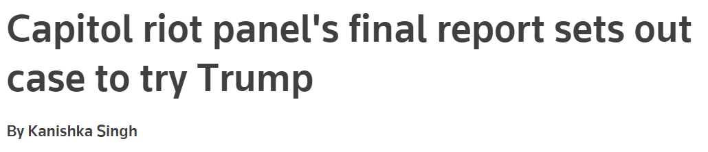 路透社发表评论说,众议院特别调查委员会的行动,标志着美国历史上国会首次要求对一名前总统提起刑事起诉。