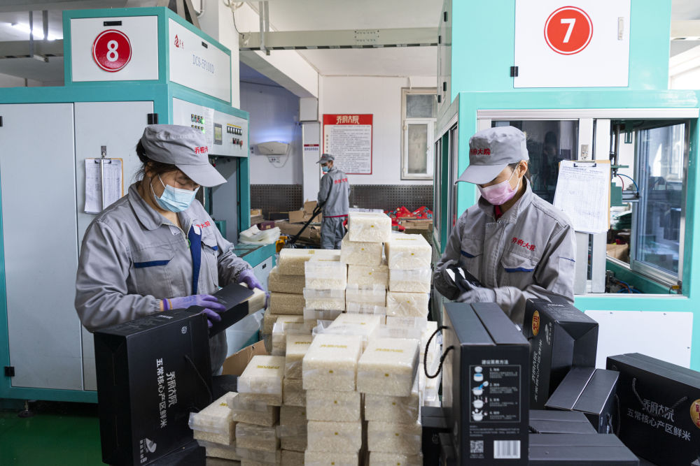 2022年11月2日,在黑龙江省五常市一大米加工企业,工作人员在包装大米。新华社记者 谢剑飞 摄