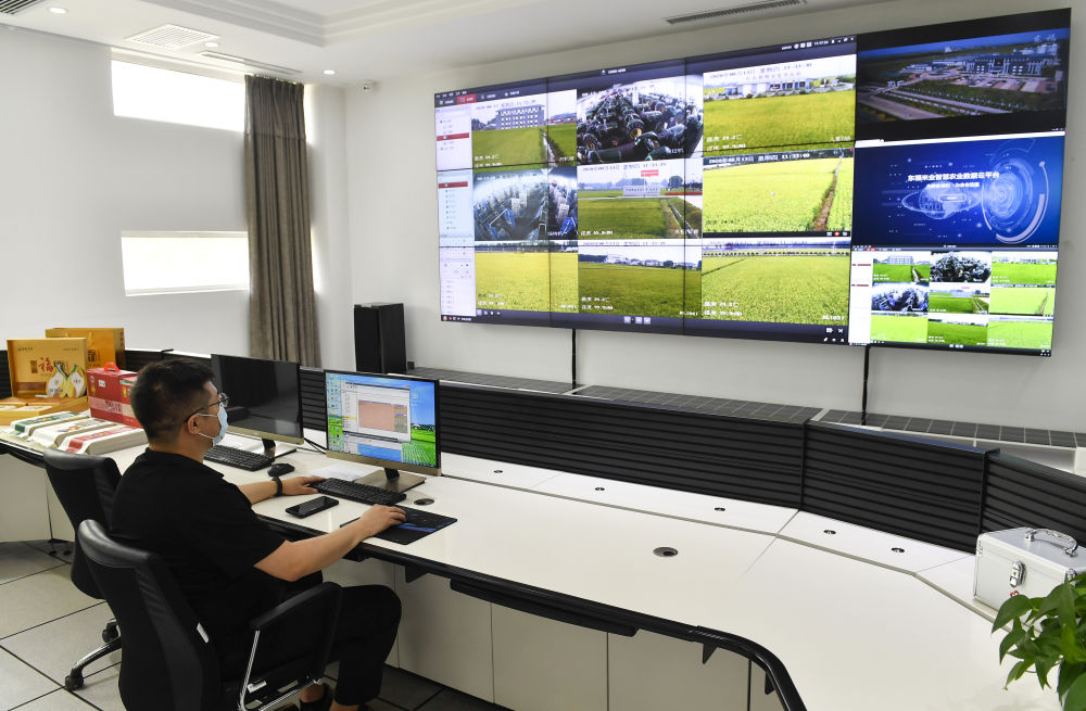 在吉林市孤店子镇东福米业现代农业信息化监视指控中心,工作人员通过监控系统查看稻田情况(2020年8月13日摄)。新华社记者 许畅 摄