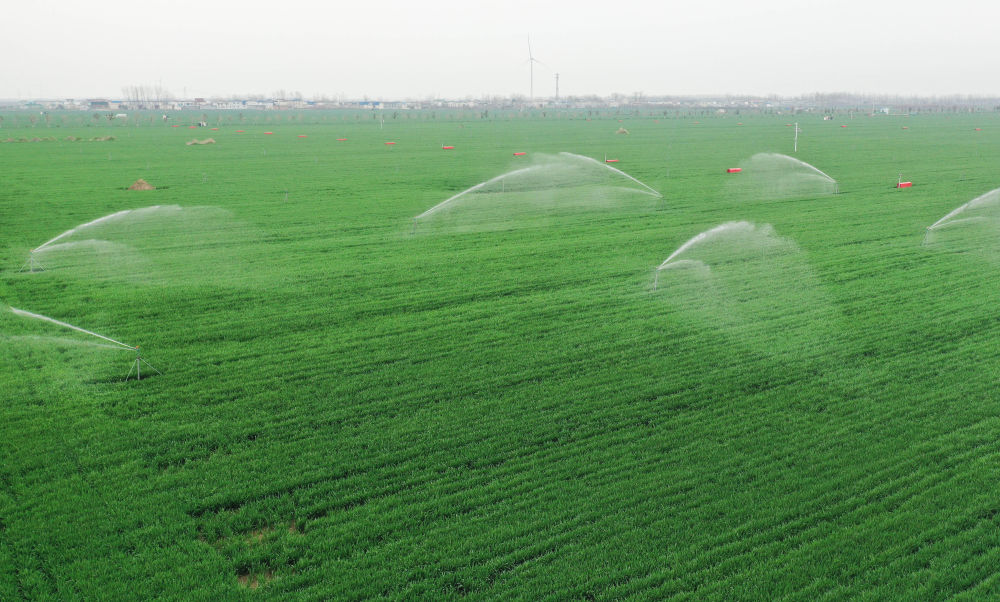 在河南省周口市商水县张庄乡高标准农田示范区,水肥一体机在为麦田浇灌(2022年3月22日摄,无人机照片)。新华社记者 张浩然 摄