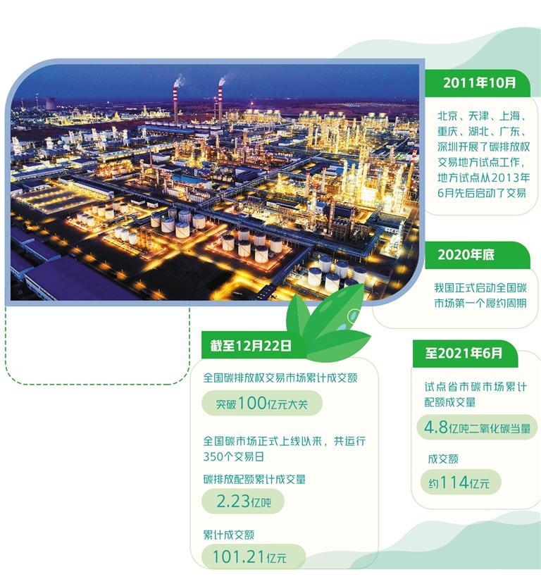 我国碳市场建设始于地方试点,2011年10月,北京、天津、上海、重庆、湖北、广东、深圳开展了碳排放权交易地方试点工作,地方试点从2013年6月先后启动了交易。2020年底,我国正式启动全国碳市场第一个履约周期。到2021年6月,试点省市碳市场累计配额成交量4.8亿吨二氧化碳当量,成交额约114亿元,有效促进了试点省市企业温室气体减排,也为全国碳市场建设进行了有益尝试。