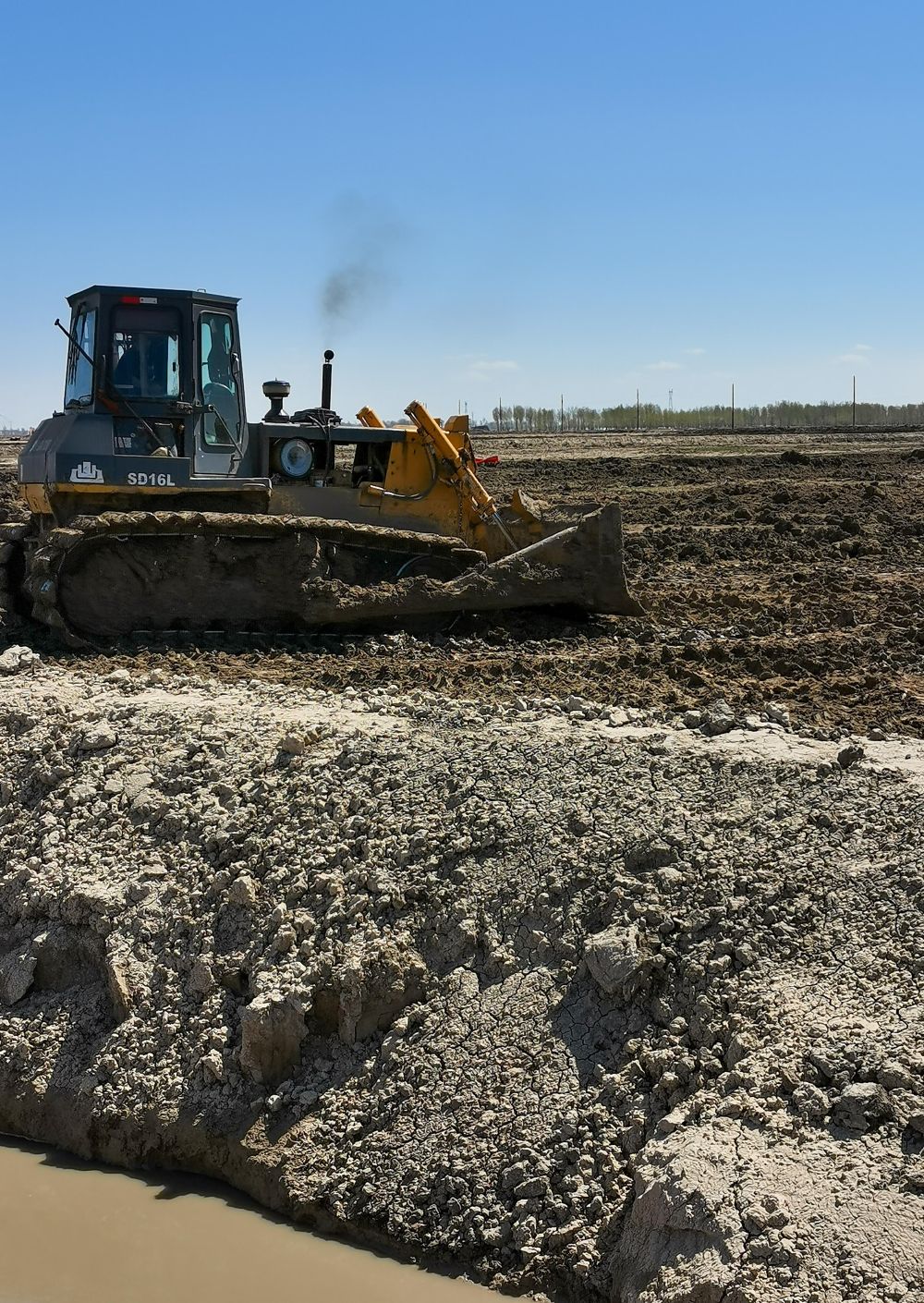 2022年2月22日,在吉林省松原市乾安县余字乡岁字村土地整治现场,工作人员操作推土机进行土地粗平作业。新华社记者 王帆 摄