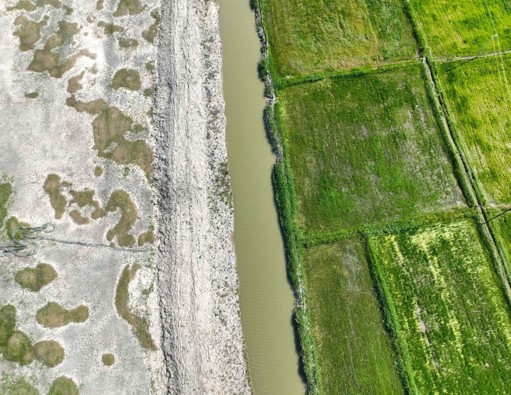 这是2022年7月12日拍摄的吉林省白城市镇赉县的稻田(右)与盐碱滩涂(无人机照片)。新华社发(潘晟昱 摄)