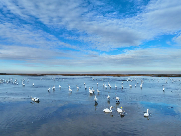 吉林省白城市镇赉县莫莫格湿地迎来大批候鸟(无人机照片,2022年11月6日摄)。新华社发(潘晟昱 摄)