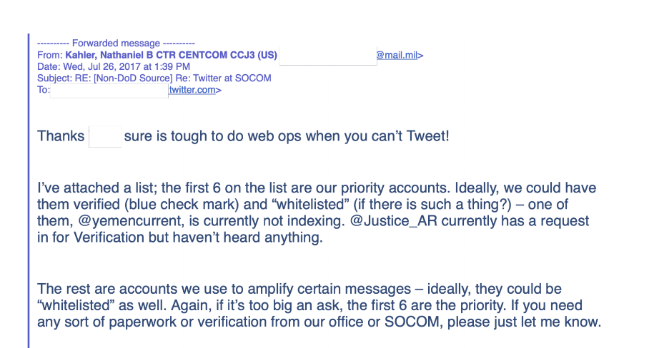 根据“截击”网站的调查记者Lee Fang从推特获取的内部文件,2017年7月,美国五角大楼下属联合作战司令部之一、中央司令部官员纳撒尼尔·卡勒给推特公共政策团队发了一个表格,上面标有52个阿拉伯语账号。