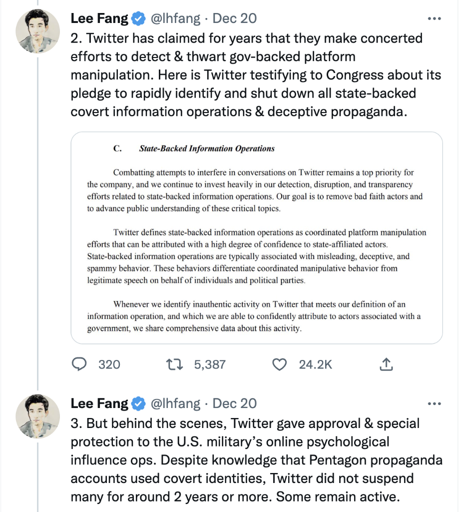 Lee Fang指出,推特一直声称“识别和阻拦其平台上政府支持的秘密信息活动和欺骗性宣传”,而在幕后,该社交媒体却为美国军方的舆论干预行为提供“批准和保护”。尽管知道五角大楼这些账号使用了假身份,但推特在至少两年时间里没有关停这些账号,一些账号至今仍在活跃。