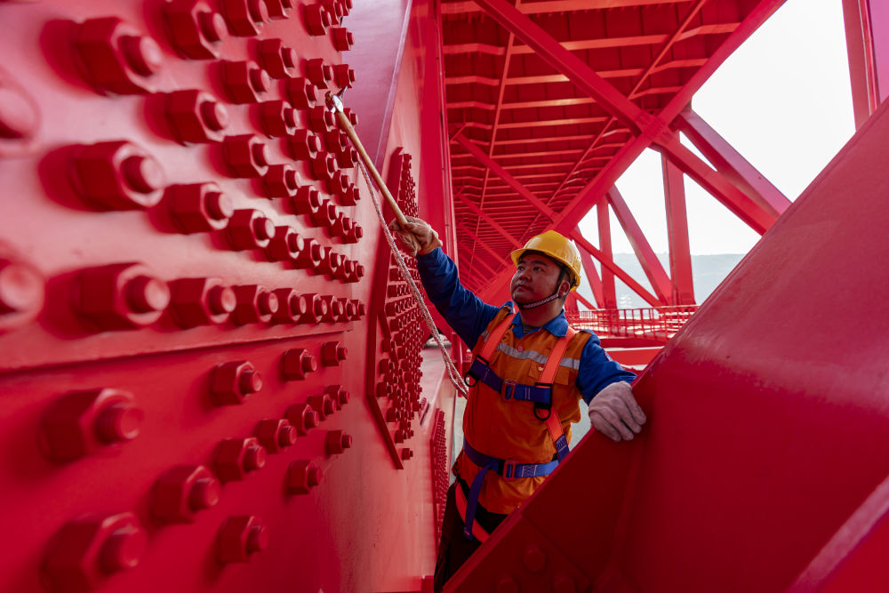 ↑ 1月18日,昆明铁路局普洱基础设施段工务维修技术中心的桥隧工施鹏彬在检查中老铁路控制性工程元江双线特大桥螺丝松紧情况。新华社记者 陈欣波 摄