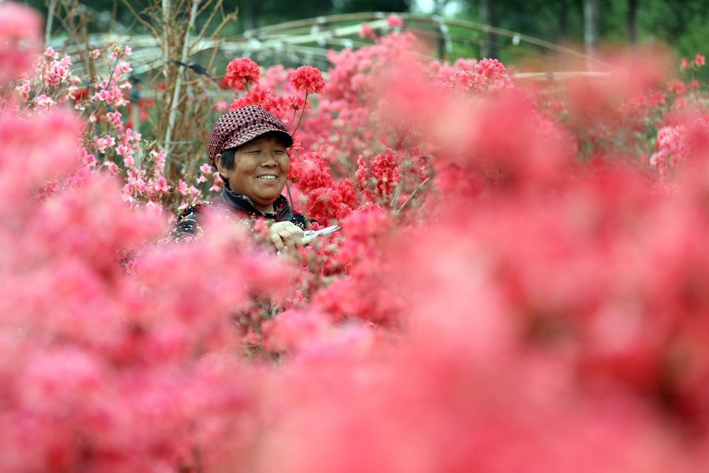 ↑ 4月29日,在石家庄市藁城区南董镇南洼村一处花卉苗木基地,工作人员在修剪花卉。新华社记者 骆学峰 摄