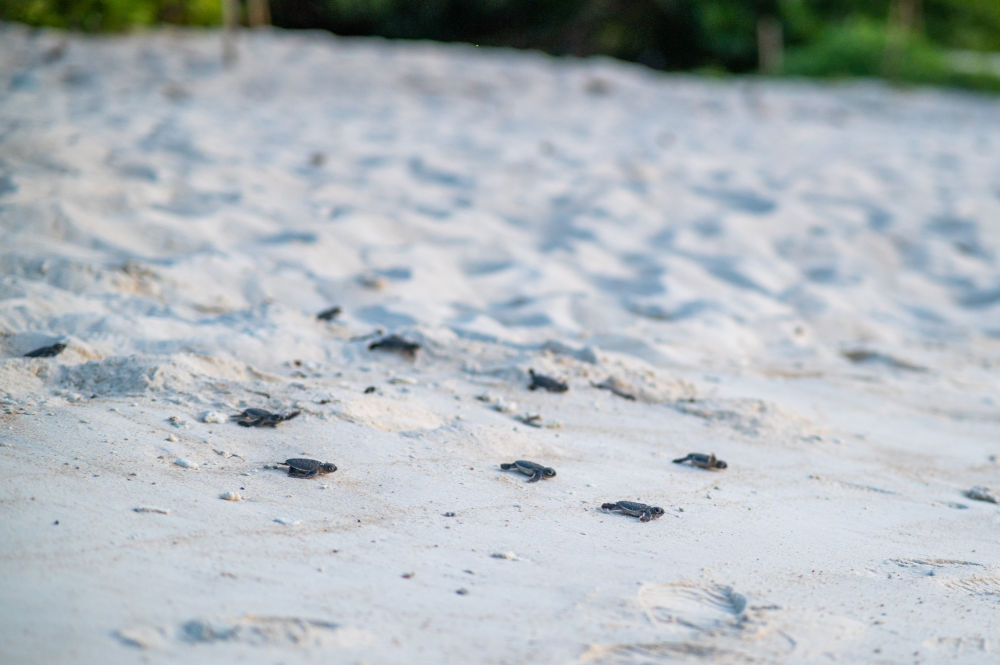 ↑ 6月14日,在马来西亚丁加奴州热浪岛北部査加尔瑚棠海龟保护区,小海龟们奔赴大海。新华社记者 朱炜 摄